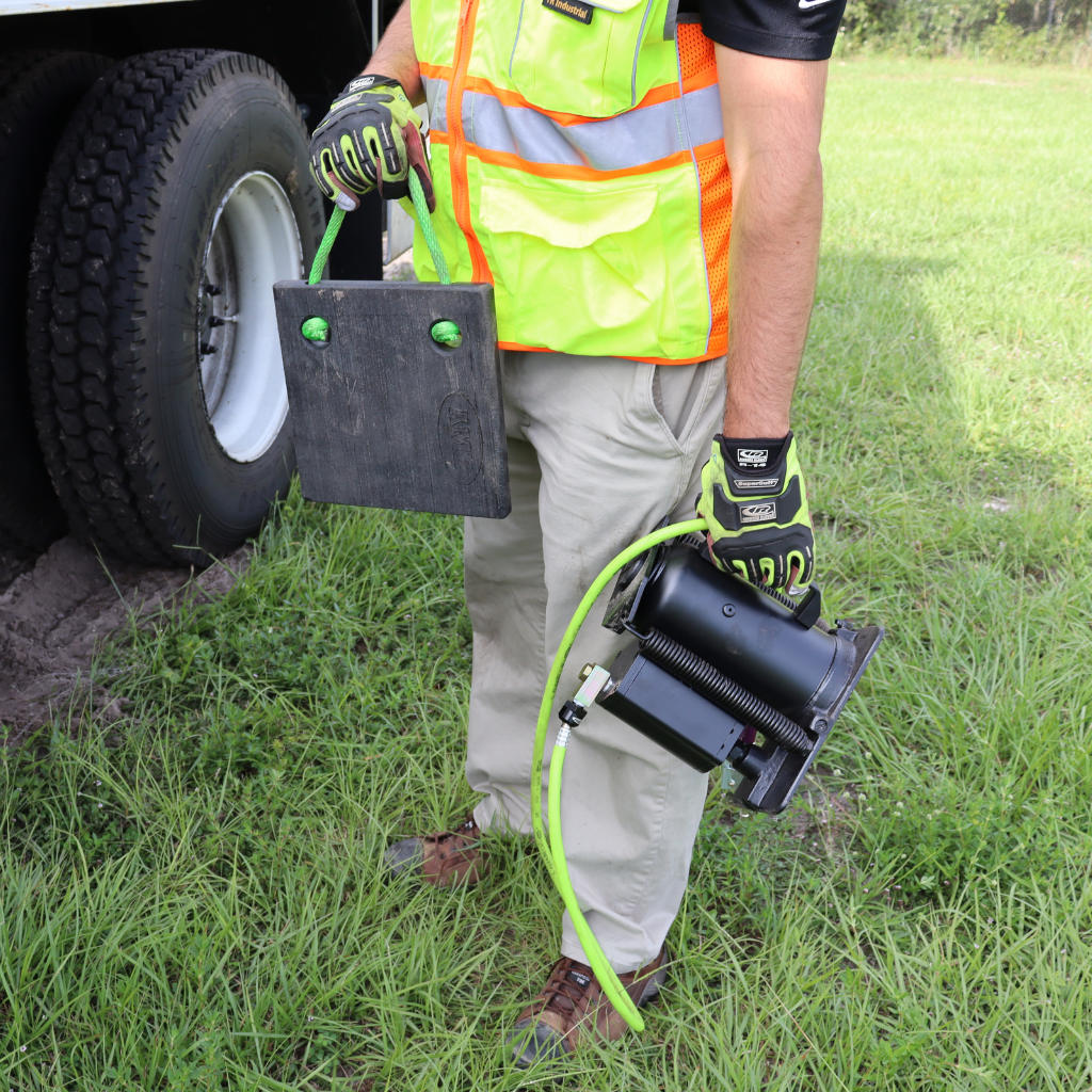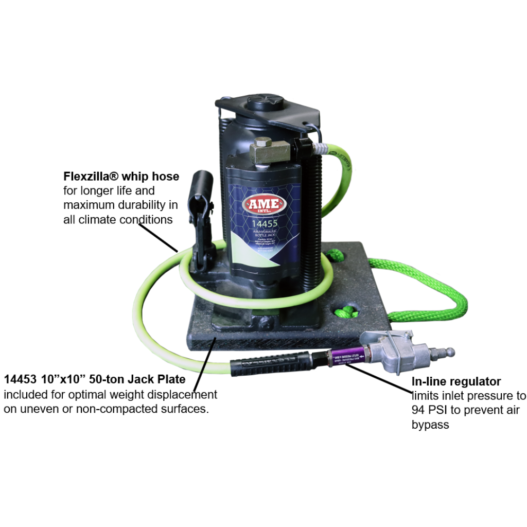 Also included: 14453 10”x10” 50-ton Jack Plate included for optimal weight displacement on uneven or non-compacted surfaces, a Flexzilla® whip hose for longer life and maximum durability in all climate conditions, and an In-line regulator limits inlet pressure to 94 PSI to prevent air bypass.