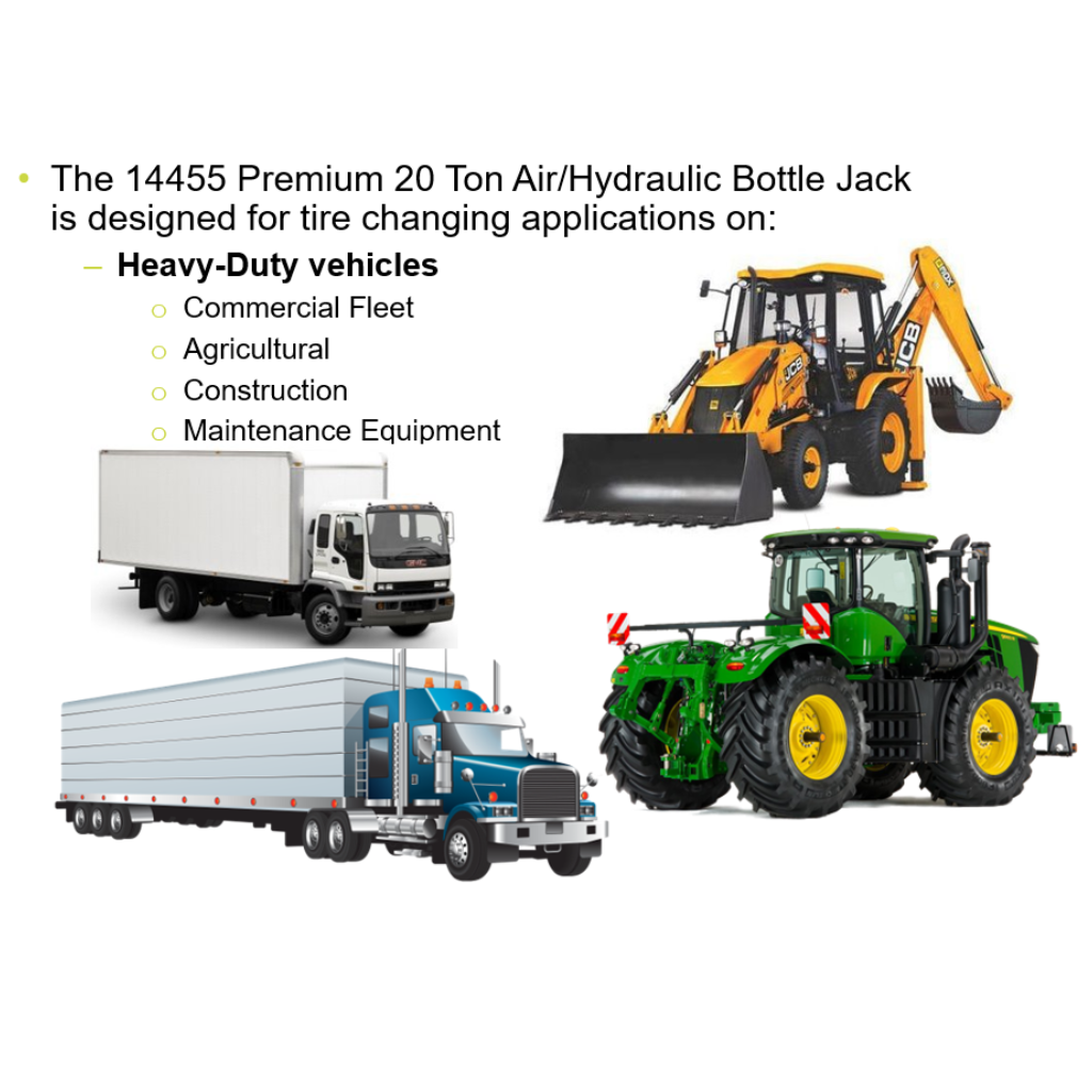 The 14455 Premium 20 Ton Air/Hydraulic Bottle Jack is designed for tire changing applications on: Heavy-Duty vehicles, Commercial Fleet, Agricultural, Construction and Maintenance Equipment