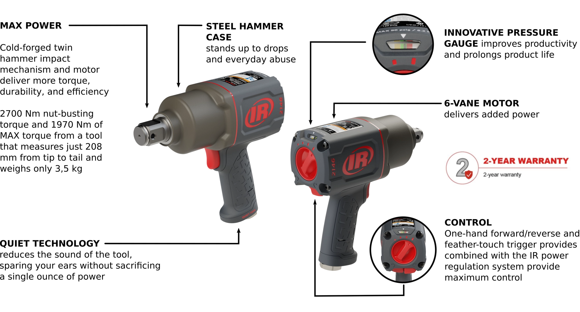 Introducing the 2146MAX Series Impact Wrenches – including the 2146Q1MAX, the most powerful 3/4" impact in its class – delivering performance and control in a durable, industrial-grade tool. For the first time, these impact wrenches combine a quiet, efficient motor with an innovative pressure gauge that lets you know it’s delivering optimized airflow and pressure. Together, these features increase productivity, save money, and prolong the life of your valuable tools.