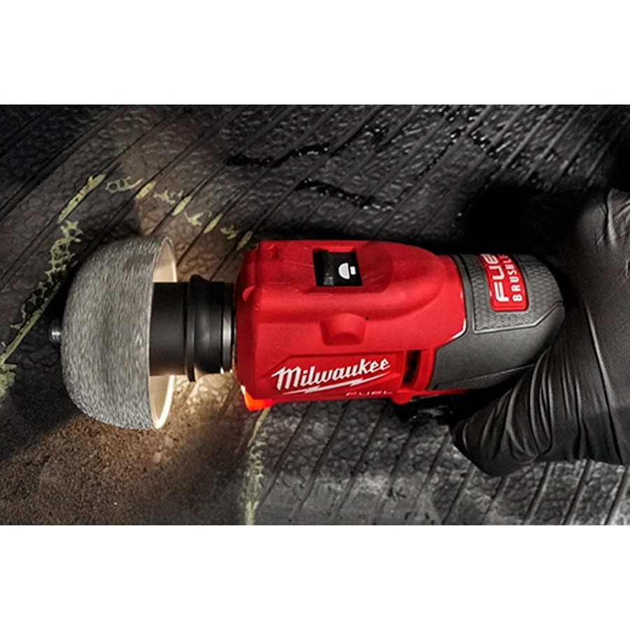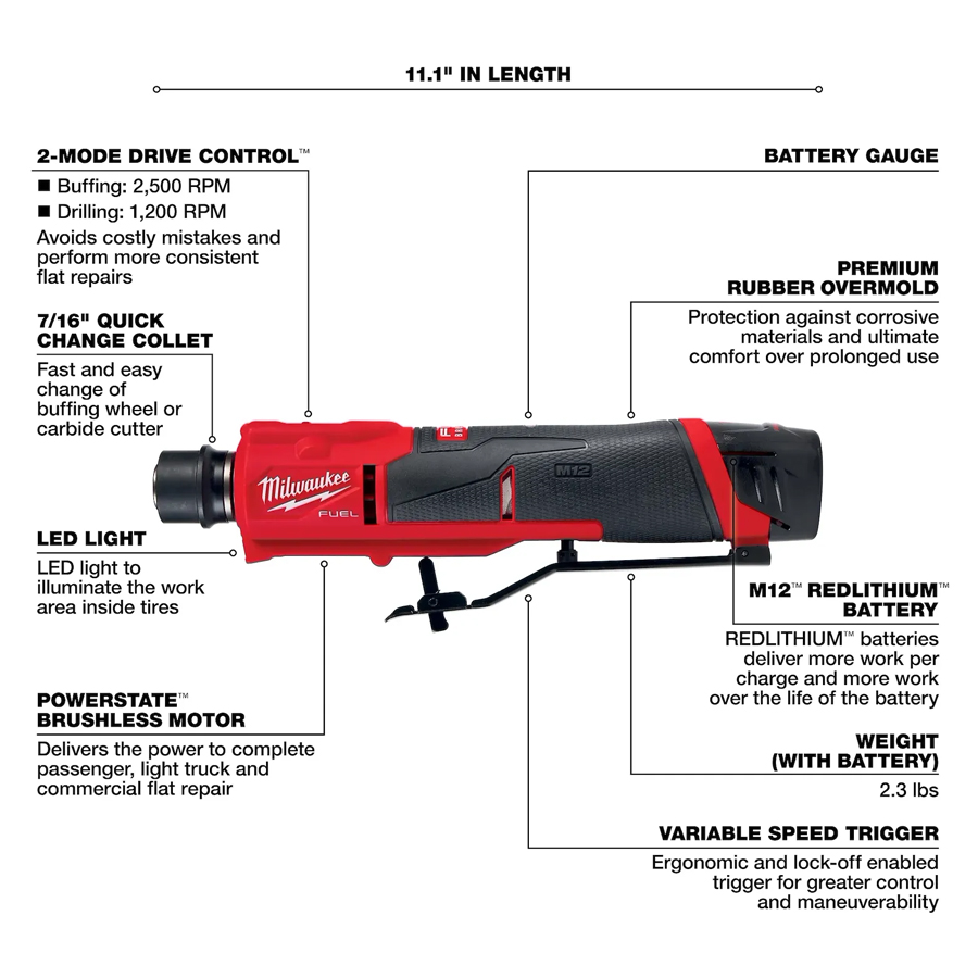 The worlds first cordless tire buffer, delivering performance, control, and runtime to replace pneumatic solutions in the shop. With our MILWAUKEE® POWERSTATE™ Brushless Motor, this tire repair tool provides the performance and size professional tire technicians demand. The tire buffer has the power to complete passenger, light truck, and commercial flat tire repairs. With 2-Mode Drive Control™, you can avoid costly mistakes by performing consistent flat tire repairs with a dedicated Buffing and Drilling mode. With the runtime to perform up to 30 flat tire repairs on a single XC4.0Ah battery, this tire buffer increases productivity with less downtime. This cordless tire buffer provides you with greater access and mobility, eliminating the frustrations of hoses and compressors.